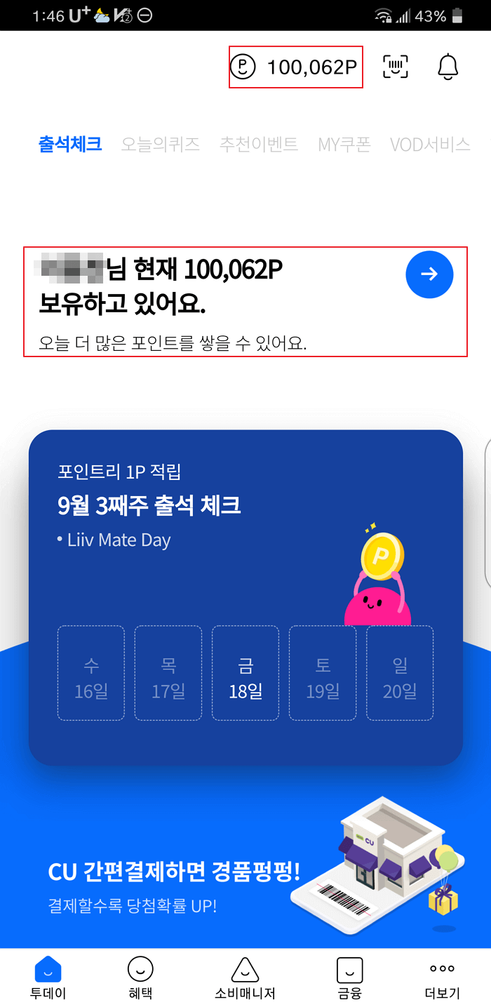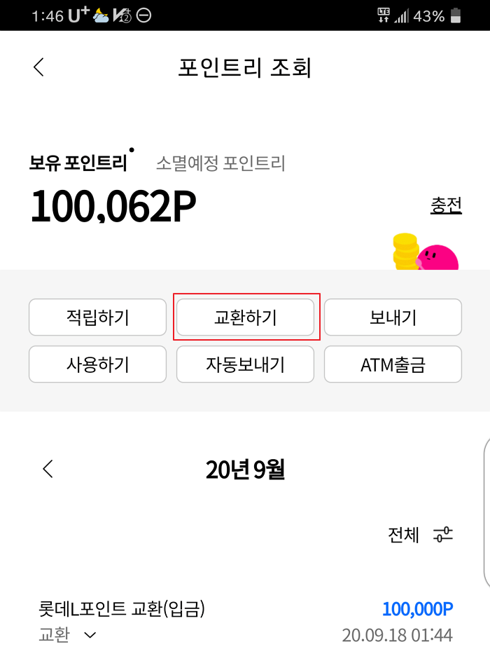 1. 앱 실행 > 상단에 포인트 그림 > 교환하기