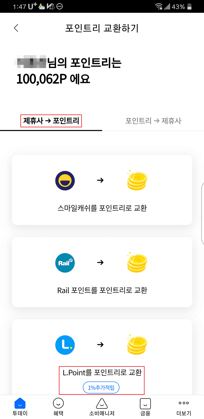 엘포인트 -> 리브메이트(포인트리) 전환 시 엘포인트 +1% 추가 적립