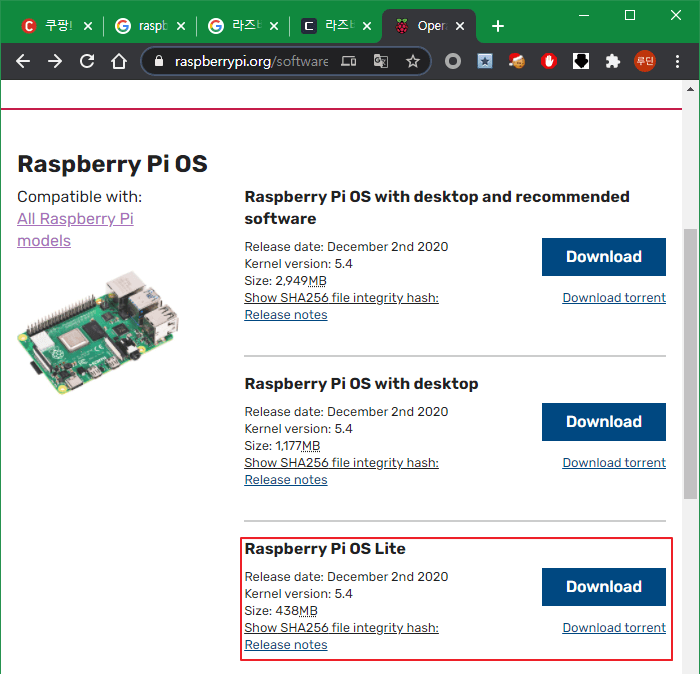 라즈베리파이 OS 다운로드 링크입니다.