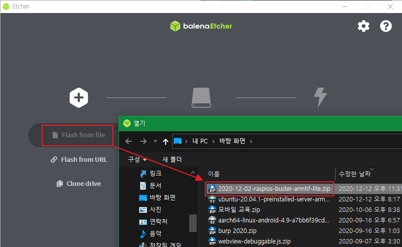 Flash from file 클릭 후 다운받은 Raspberry Pi OS Lite를 선택합니다.