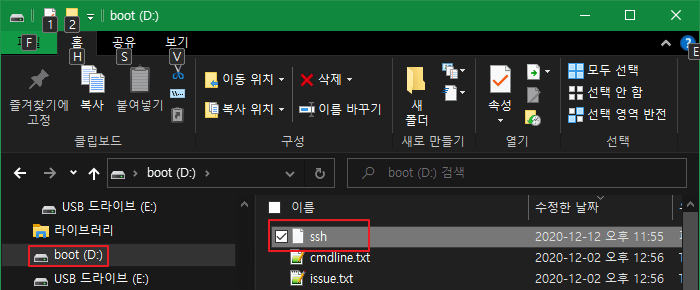 위에서 boot (D:) 드라이브에 ssh 파일 생성 시