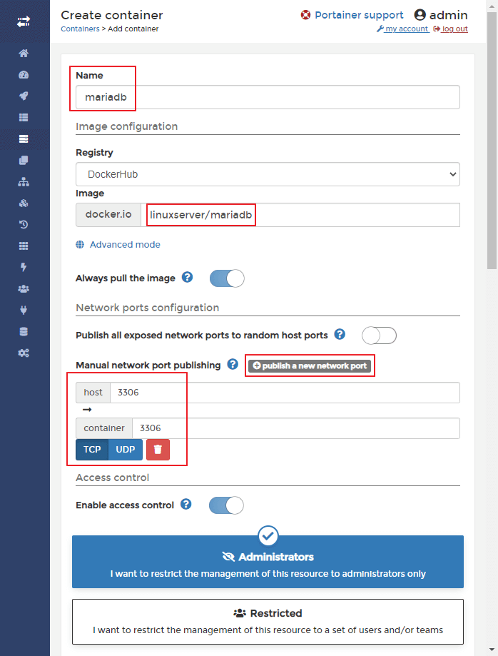 | -e MYSQL_ROOT_PASSWORD=ROOT_ACCESS_PASSWORD | MariaDB 관리자 비밀번호(최소 4글자 이상) |