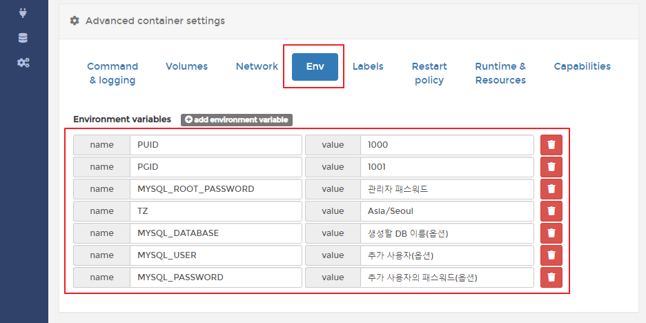 | -e PUID=1000 | 리눅스 사용자의 ID(pi: 1000) |