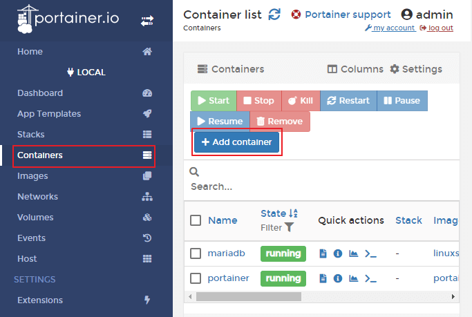 Portainer로 접속하여