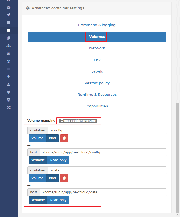 | -v /config | NextCloud 설정 파일을 저장할 위치 |