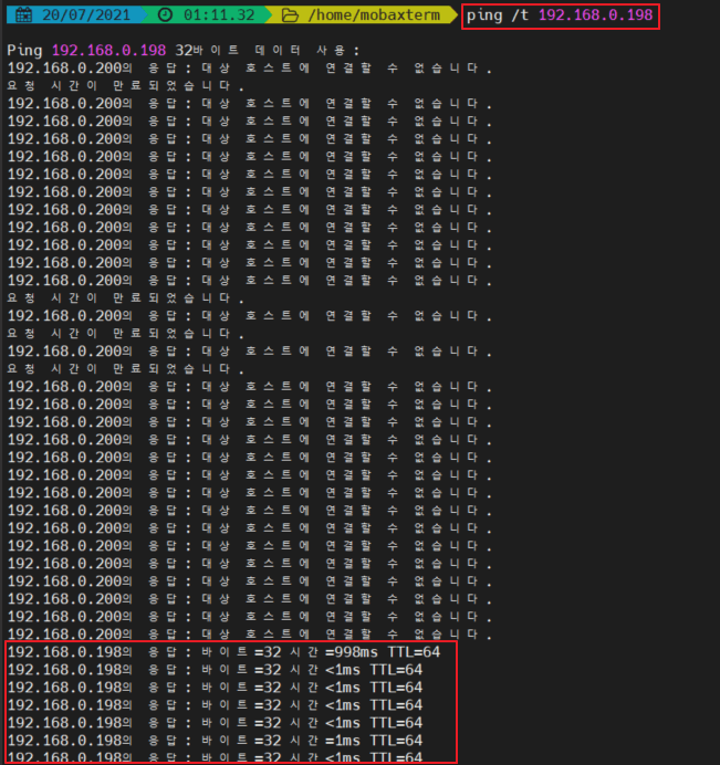 window> ping /t [라즈베리파이 주소]
