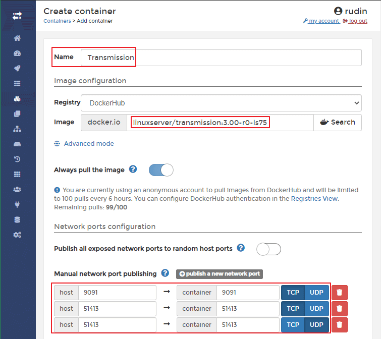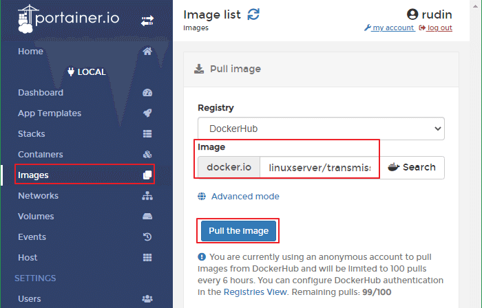 Image > Image: linuxserver/transmission 입력 > Pull the image