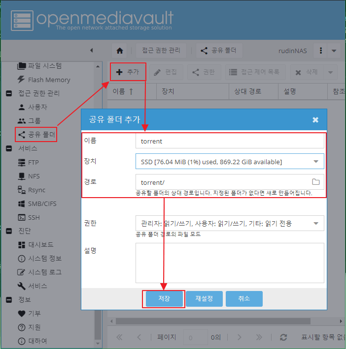 OMV 웹 페이지 > 공유 폴더 > 추가 >