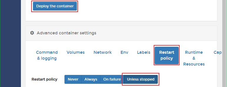 Restart policy > Unless stopped