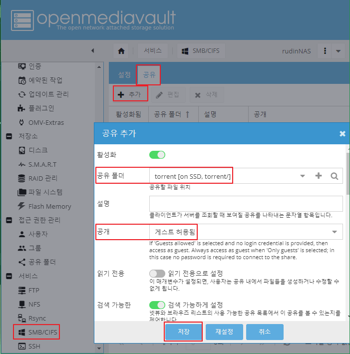 OMV 웹 페이지 > SMB/CIFS > 공유 > 추가 >