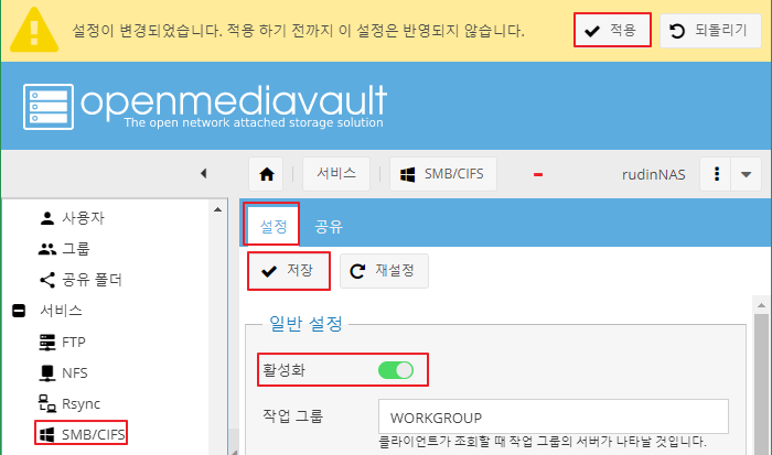 OMV 웹 페이지 > SMB/CIFS > 설정 > 활성화 > 저장 > 적용
