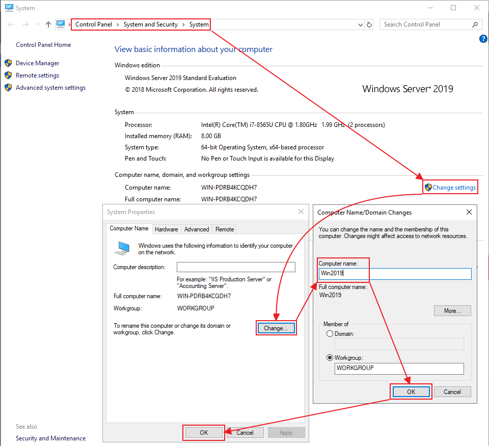 > Change settings > Change > Hostname 입력