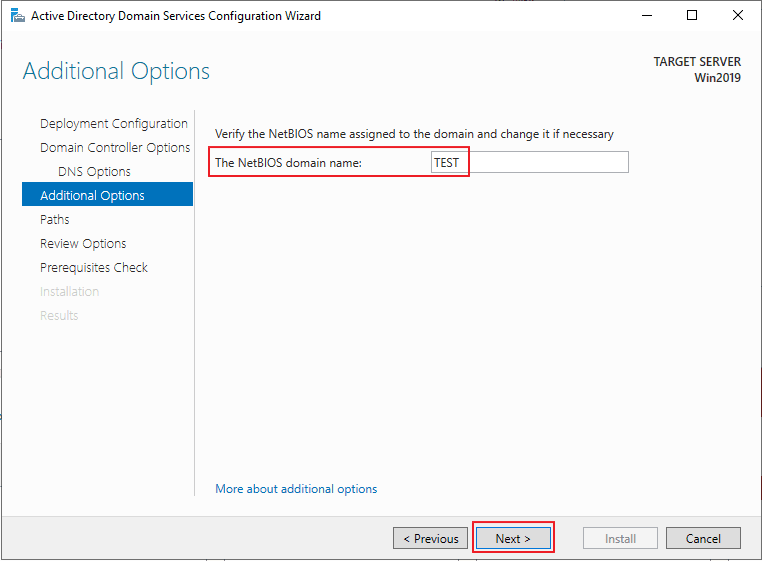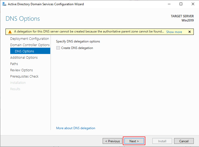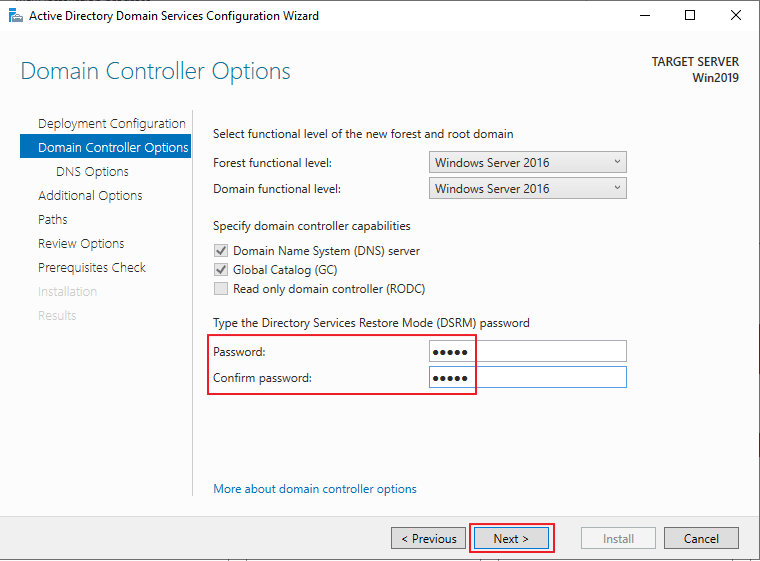 > Type the Directory Services Restore Mode(DSRM) password 입력 > Next