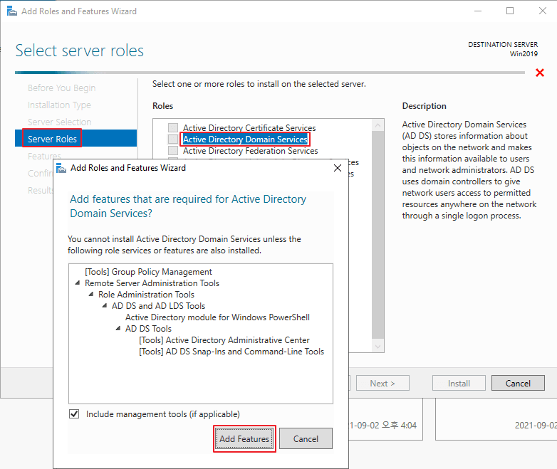> Active Directory Domain Services 선택 > Add Features