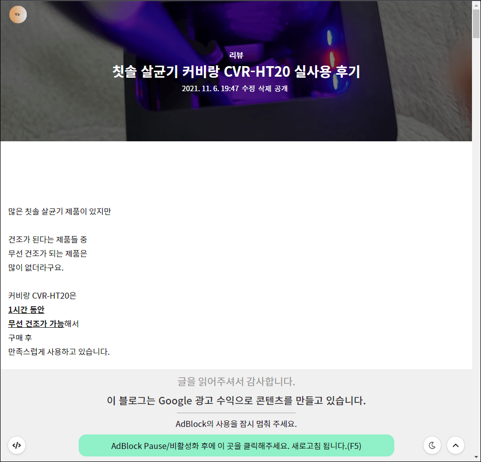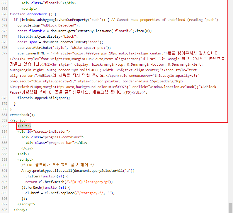 span.innerHTML = '<h4 style="color:#999;margin:10px auto;text-align:center;">글을 읽어주셔서 감사합니다.</h3><h4 style="font-weight:500;margin:10px auto;text-align:center;">이 블로그는 Google 광고 수익으로 콘텐츠를 만들고 있습니다.</h1><hr style=" display: block;margin-top: 0.5em;margin-bottom: 0.5em;margin-left: auto;margin-right: auto; border:1px solid #CCC; width: 25%;text-align:center;"><span style="text-align:center;">AdBlock의 사용을 잠시 멈춰 주세요.</span><div onmouseover="this.style.opacity=.5;" onmouseout="this.style.opacity=1;" style="cursor:pointer; border-radius:15px;padding:10px 60px;width:510px;margin:10px auto;background-color:#1ef09975;" onclick="window.location.reload();">AdBlock Pause/비활성화 후에 이 곳을 클릭해주세요. 새로고침 됩니다.(F5)</div>';
