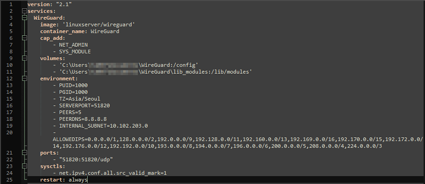 - 51820:51820/udp # WireGuard의 포트와 실제 포트 연결