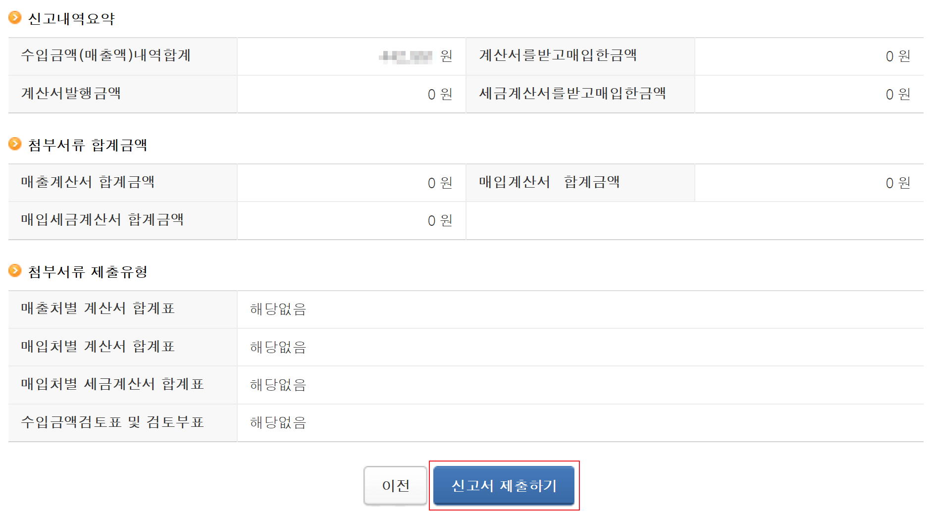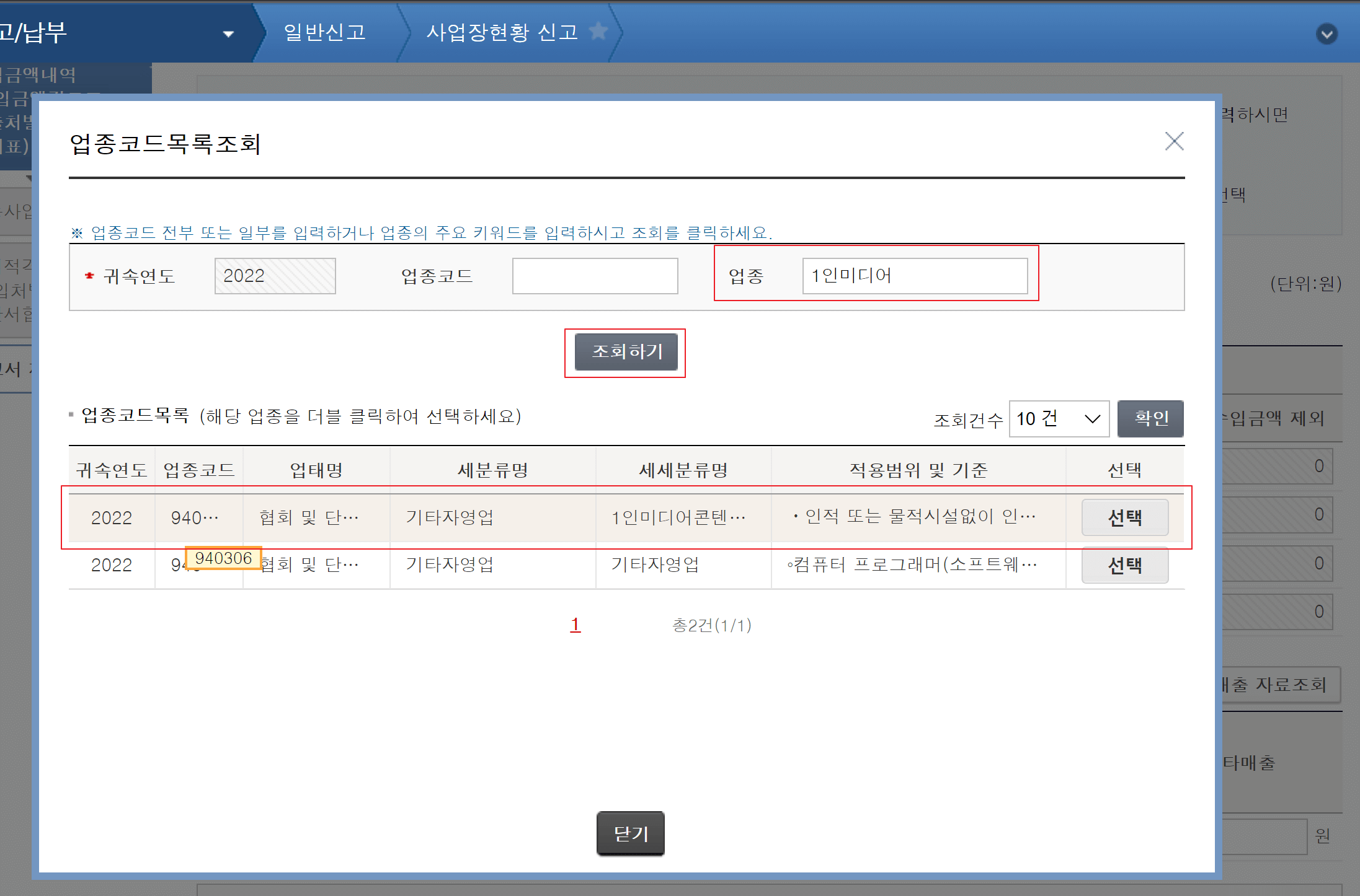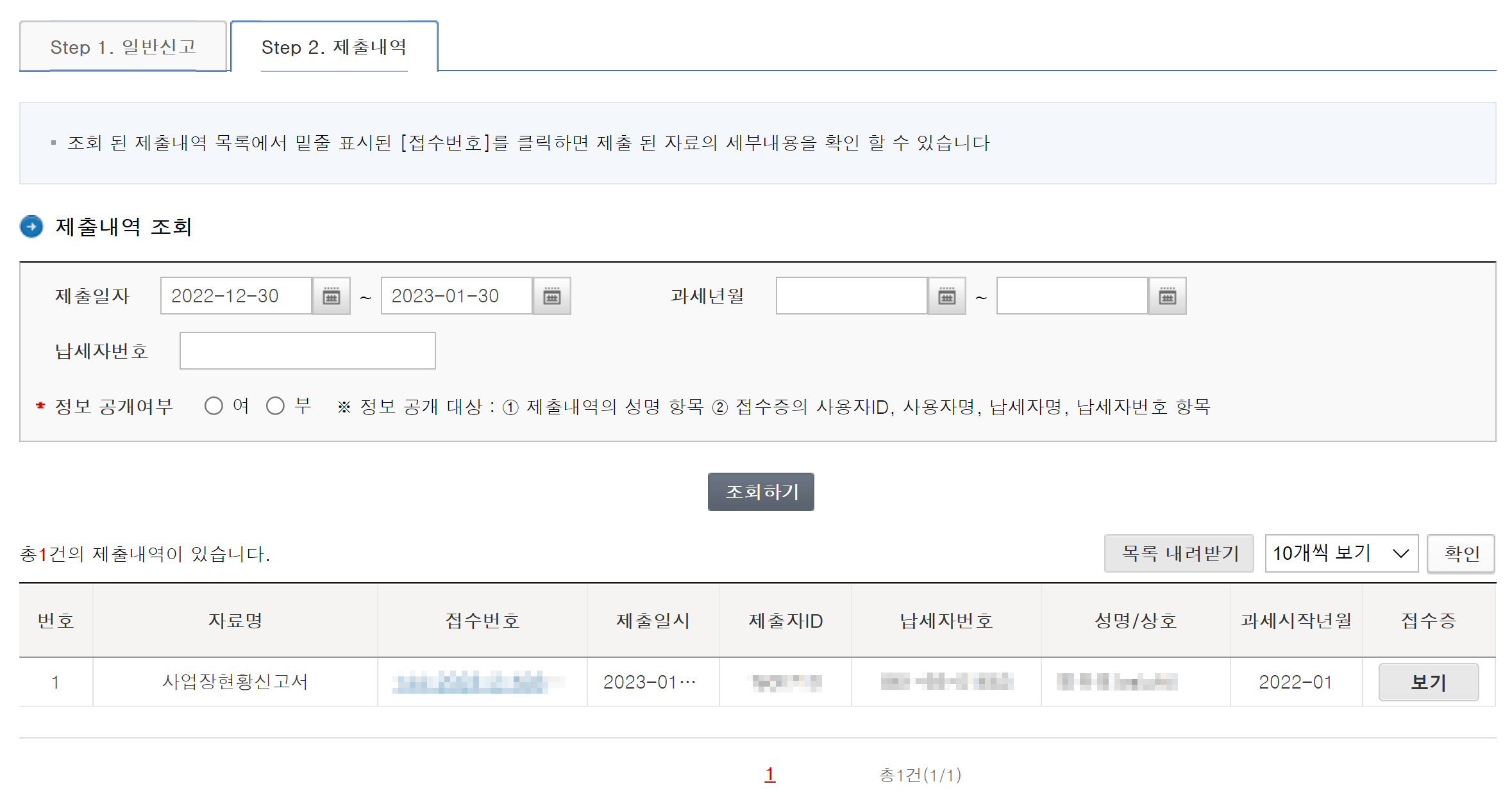 신고/납부 > 일반신고 > 사업장현황 신고 > Step 2. 제출내역 > 조회하기