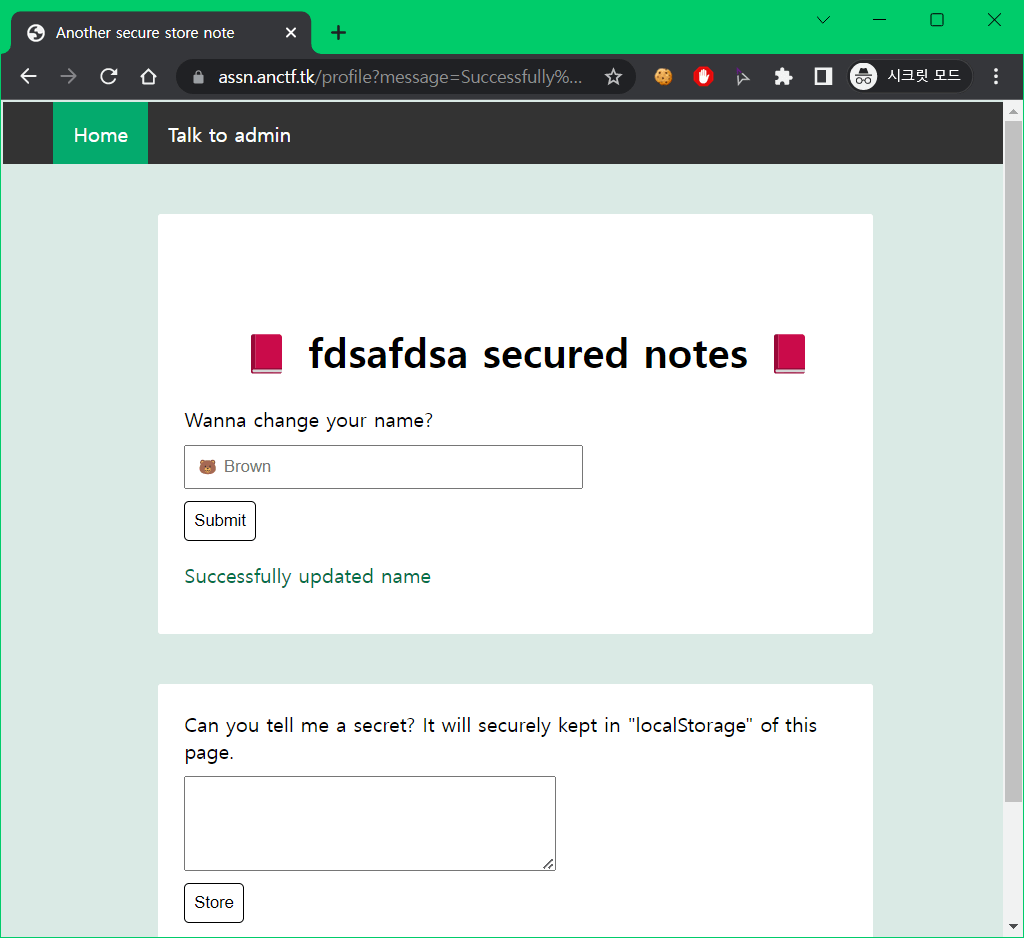 /* FLAG를 ADMIN의 localStorage에 secret에 저장*/