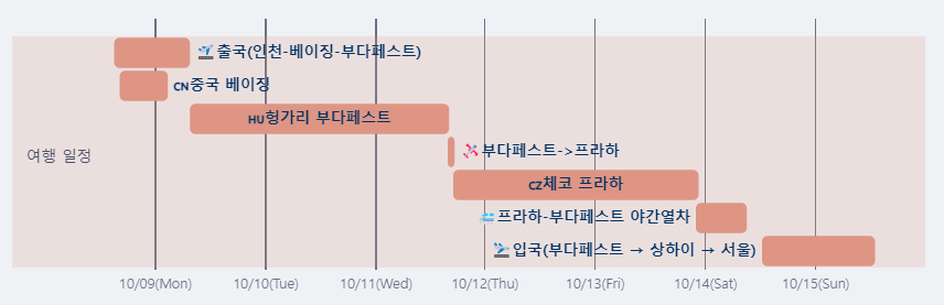 일정: 인천 -> 베이징 -> 부다페스트 -> 프라하 -> 상하이 -> 인천.