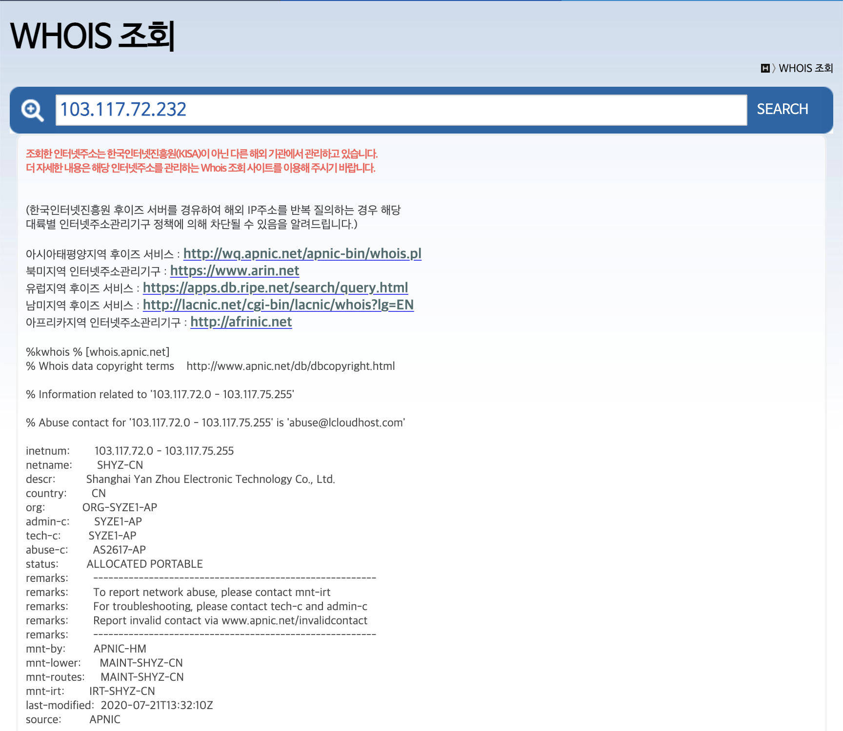 아래는 사기 사이트 IP 조회 결과