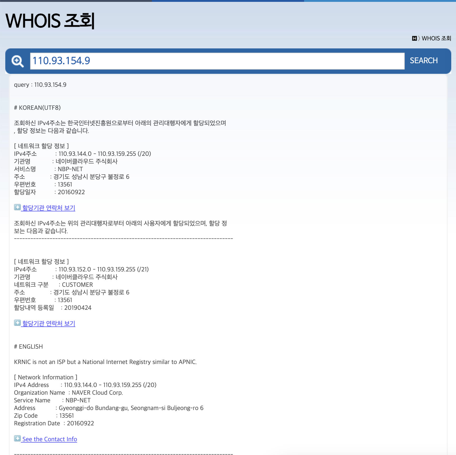 아래는 네이버 IP 조회 결과